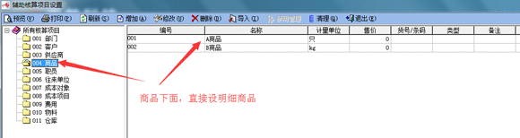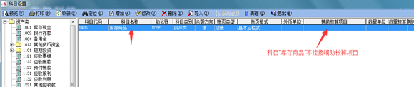 二、 在科目設(shè)置模塊,存貨類科目,如庫存商品、原材料等科目,不要掛接輔助核算項目,如下圖: