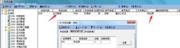 2、科目“應(yīng)付賬款”掛接輔助核算項目“供應(yīng)商”,科目設(shè)置模塊進行設(shè)置,如下圖:
