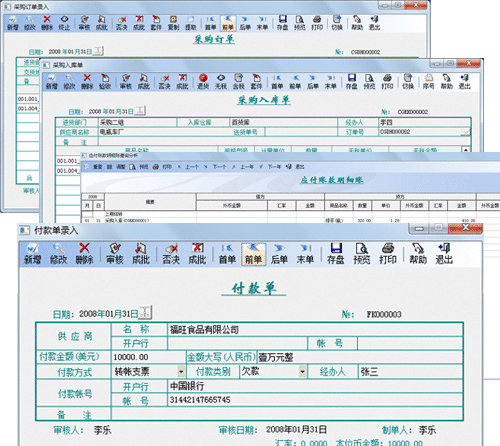 采購(gòu)管理系統(tǒng)對(duì)企業(yè)采購(gòu)業(yè)務(wù)進(jìn)行全面控制。本系統(tǒng)主要包括采購(gòu)訂單管理、采購(gòu)入庫(kù)管理、采購(gòu)結(jié)算管理及統(tǒng)計(jì)報(bào)表等模塊,能自動(dòng)處理應(yīng)付賬款、庫(kù)存數(shù)量及金額,實(shí)時(shí)提供各類分析數(shù)據(jù),包括應(yīng)付賬款明細(xì)賬,暫估入庫(kù)單據(jù)明細(xì)表等。系統(tǒng)能對(duì)最后進(jìn)價(jià)進(jìn)行實(shí)時(shí)提醒,提供完善的商品批次、保質(zhì)期采集功能,并可以根據(jù)需要自動(dòng)生成批次號(hào)。